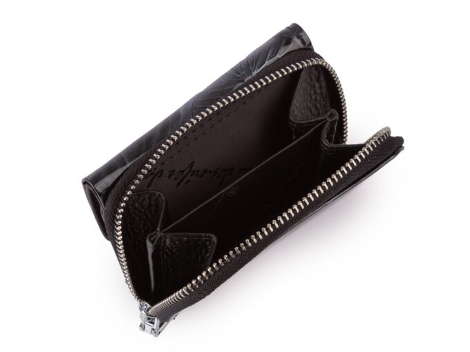 - Mała, czarna portmonetka damska lakierowana z miejscem na bankoty i kieszenią na monety zapinaną na zamek.