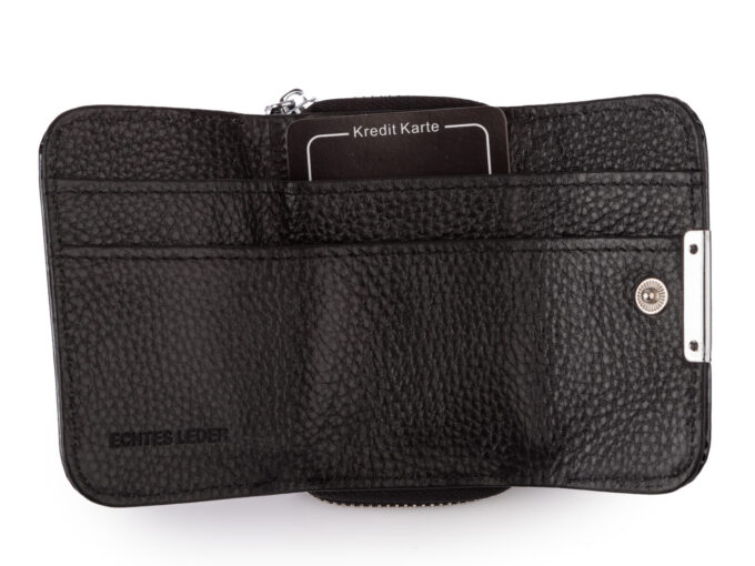 - Mały portfelik damski, idealny do małej torebki wieczorowej lub do kieszeni spodni.