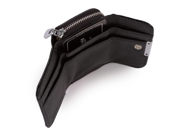 - Portfel posiada zapinaną na metalowy zatrzask część przeznaczoną na banknoty z dwiema przegrodami. Można w niej także umieścić pionowo kartę płatniczą lub dokument wielkości dowodu osobistego.