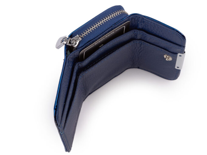 - Portfel posiada zapinaną na metalowy zatrzask część przeznaczoną na banknoty z dwiema przegrodami. Można w niej także umieścić pionowo kartę płatniczą lub dokument wielkości dowodu osobistego.