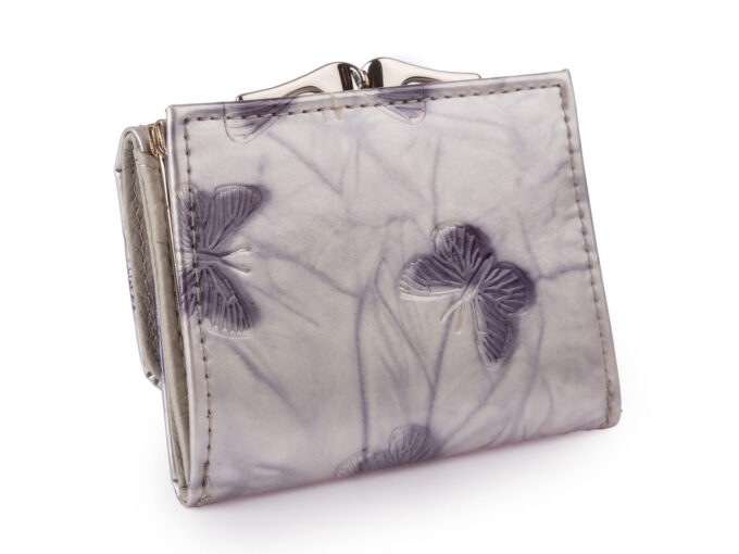 - Mała srebrna portmonetka damska zapinana na bigiel z modnym tłoczeniem w motyle.