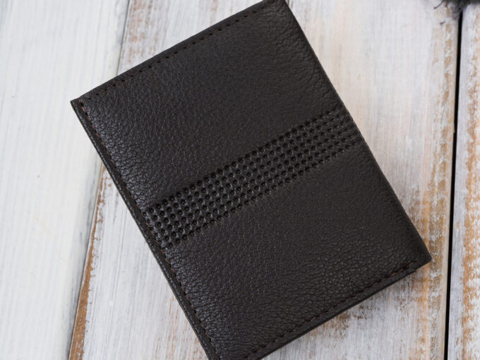 • Malutki mini-portfel męski skórzany z miejscem tylko na karty i banknoty, ciemnobrązowy.