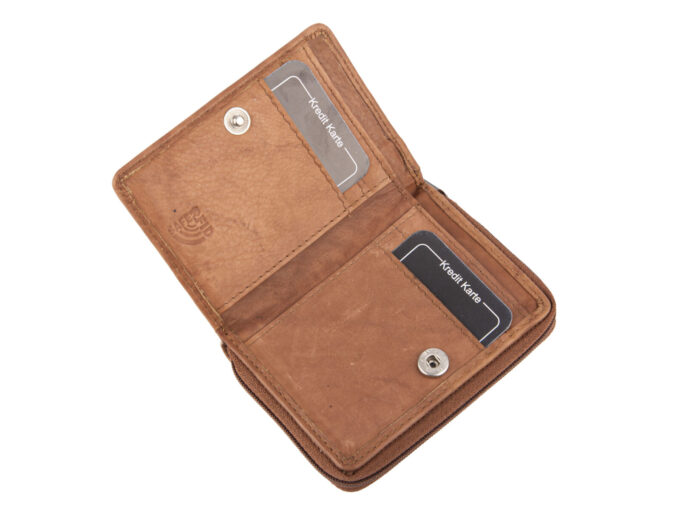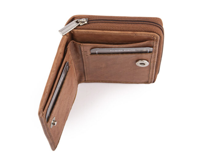 - Wewnątrz portfel posiada miejsce na karty płatnicze i lojalnościowe, dokumenty wielkości dowodu osobistego albo prawa jazdy, banknoty, oraz monety.