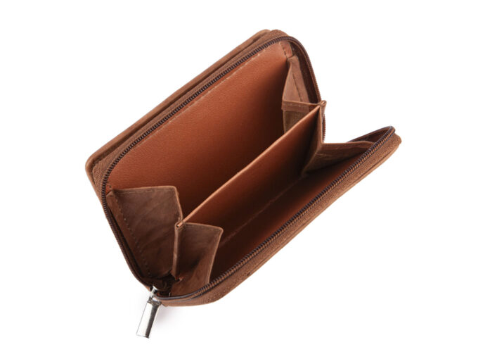 - Mały portfel damski uszyty z miękkiej skóry naturalnej w kolorze jasnobrązowym.