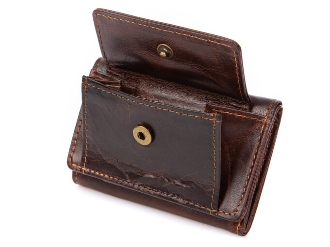 - Na zewnątrz portfela umieszczono kieszonkę na bilon, zapinaną na patkę z metalowym zatrzaskiem.