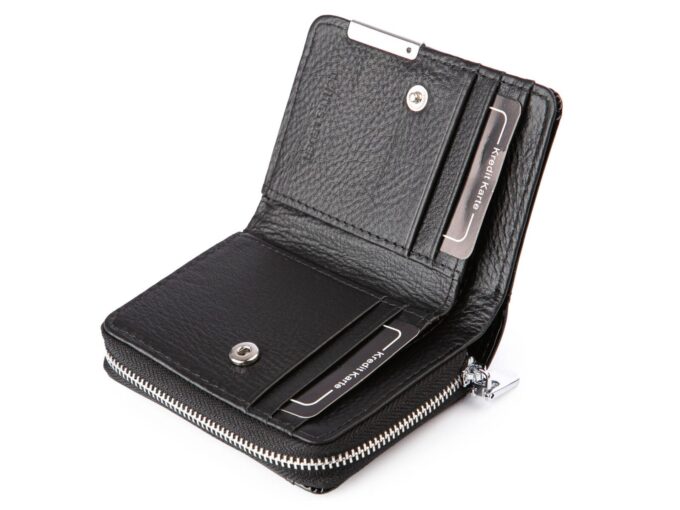 - Bezpieczne Zapięcie: Portfel jest zapinany na zatrzask a kieszeń na monety na szczelny zamek błyskawiczny, zapewnia to dodatkowe bezpieczeństwo przechowywanych rzeczy.