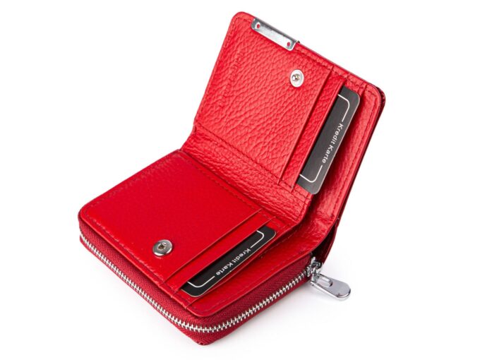 - Bezpieczne Zapięcie: Portfel jest zapinany na zatrzask a kieszeń na monety na szczelny zamek błyskawiczny, zapewnia to dodatkowe bezpieczeństwo przechowywanych rzeczy.