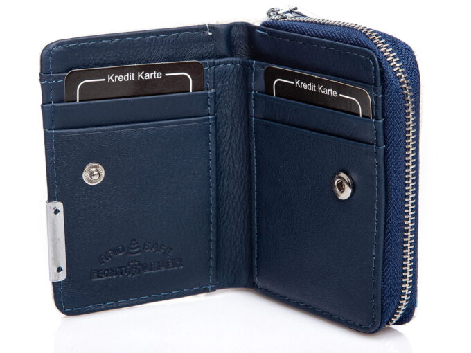 - Portmonetka posiada kieszonkę na bilon z dwiema przegródkami, zamykaną na metalowy chromowany zamek błyskawiczny.