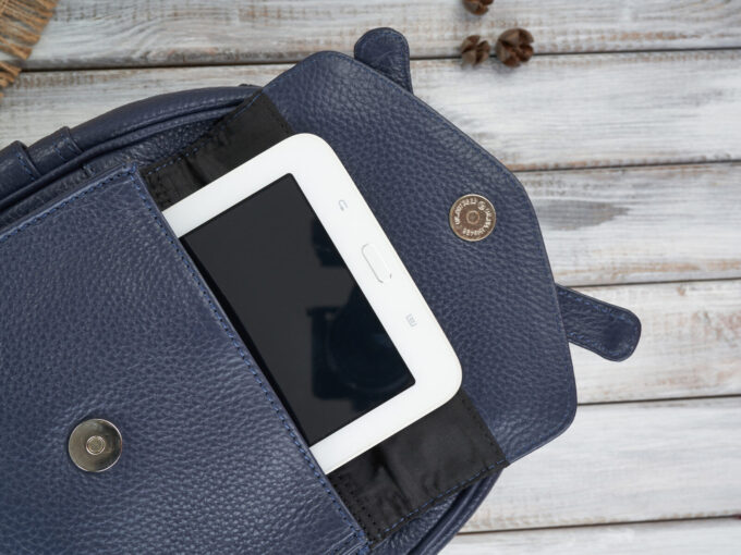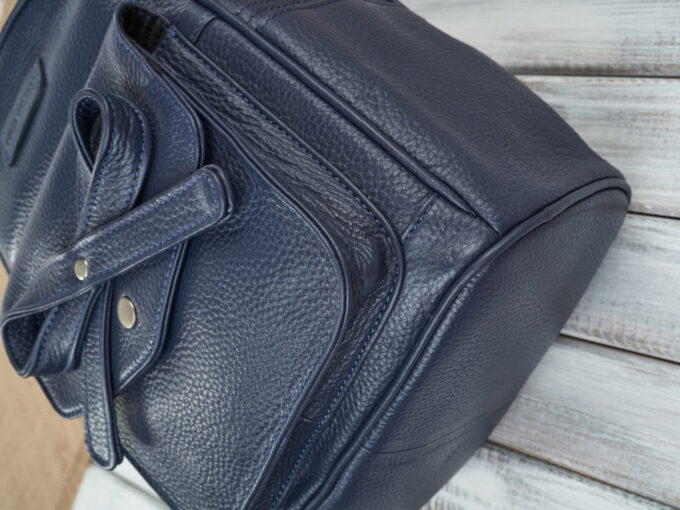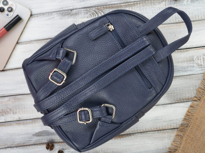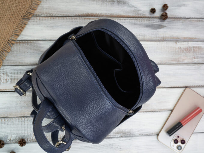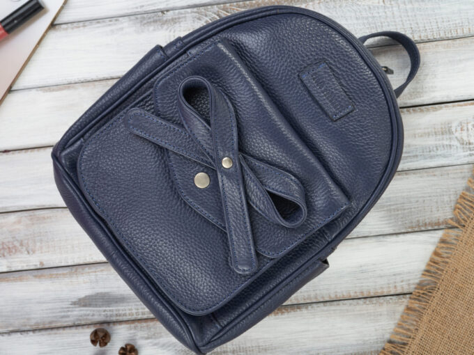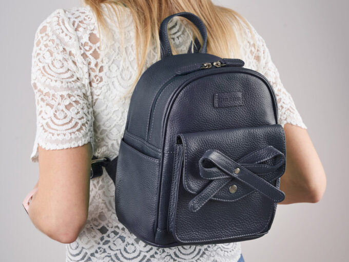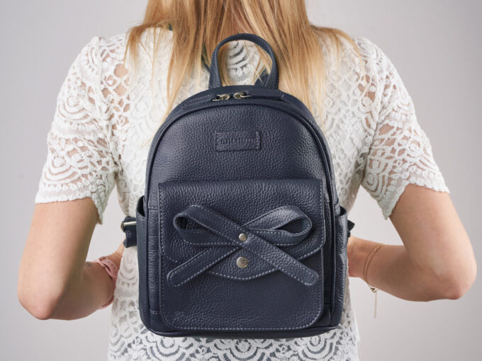 - Mały, skórzany plecak damski, miejski z oryginalną kokardką z przodu, ciemnoniebieski – granatowy.