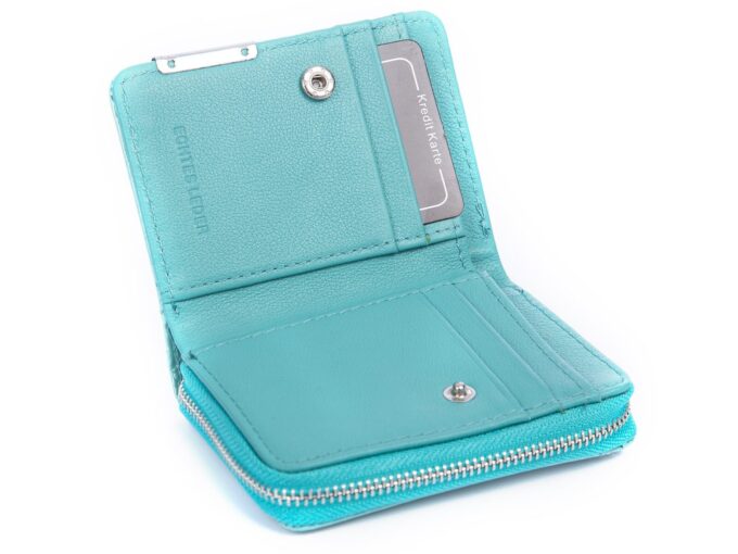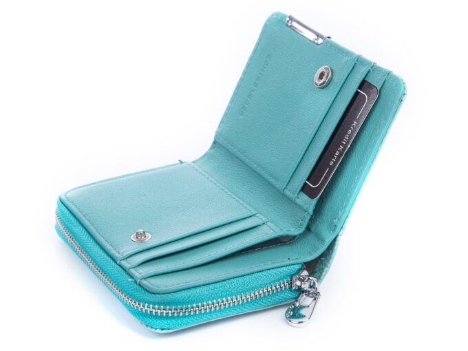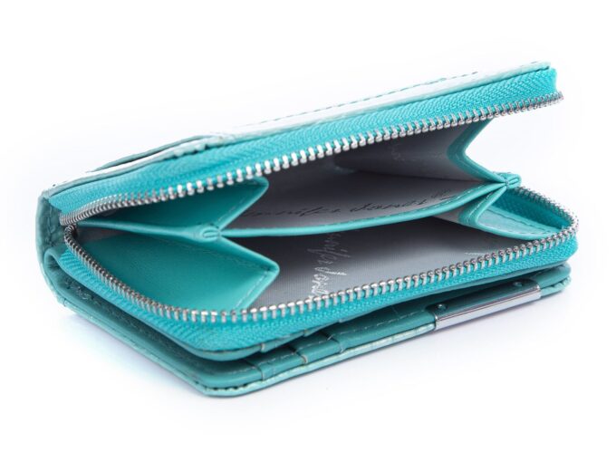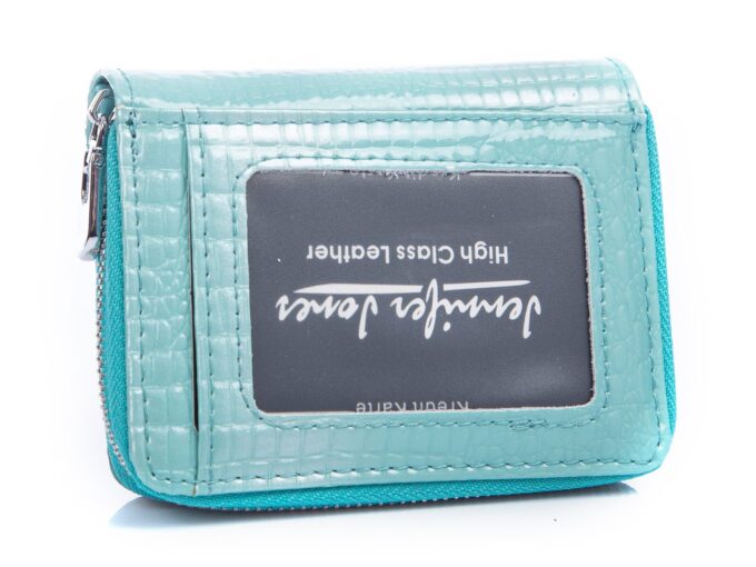 - Mały, jasno-turkusowy, portfel damski, lakierowany z kieszenią na monety zapinaną na zamek.