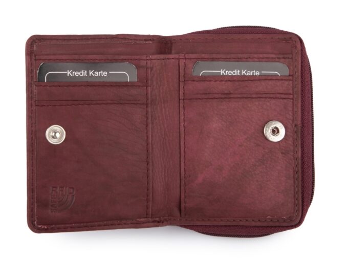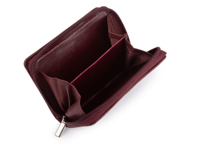 - Mały portfel damski uszyty z miękkiej skóry naturalnej w kolorze burgundowym.