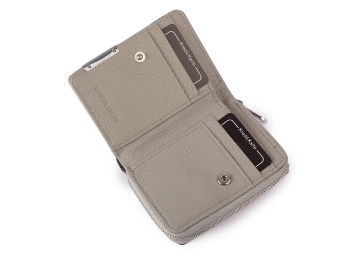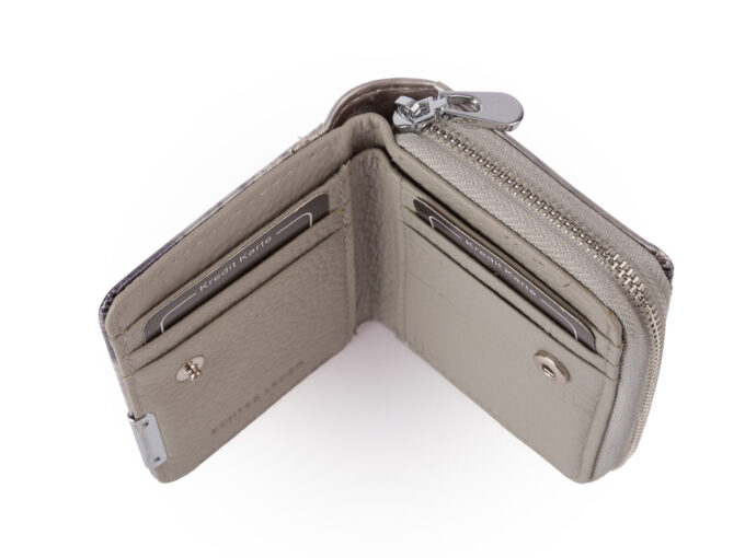 - Posiada pojemną kieszonkę na bilon z dwiema przegródkami, zamykaną na metalowy zamek błyskawiczny.