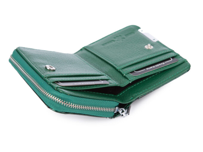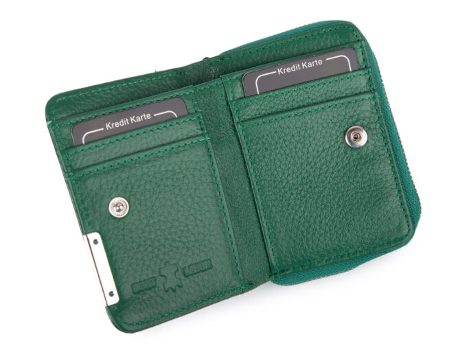 - Posiada pojemną kieszonkę na bilon z dwiema przegródkami, zamykaną na metalowy zamek błyskawiczny.