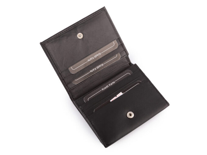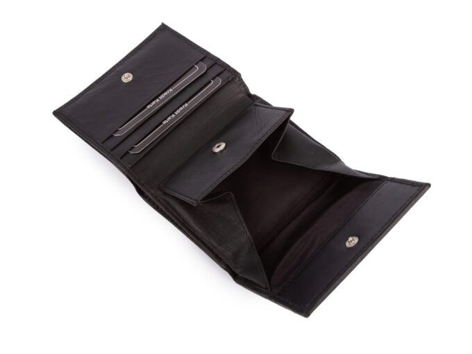 - Wyposażony w praktyczną kieszeń na bilon typu „pudełko” lub „piekiełko” — otwierana szeroko jak koperta, z zapięciem na zatrzask, z wysokimi bokami, dzięki którym monety nie wypadają podczas przeglądania zawartości.
