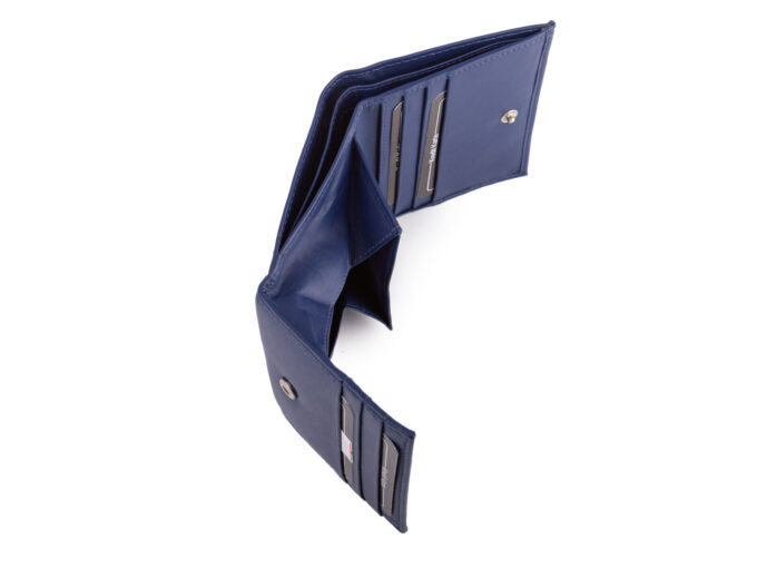 - Wyposażony w praktyczną kieszeń na bilon typu „pudełko” lub „piekiełko” — otwierana szeroko jak koperta, z zapięciem na zatrzask, z wysokimi bokami, dzięki którym monety nie wypadają podczas przeglądania zawartości.