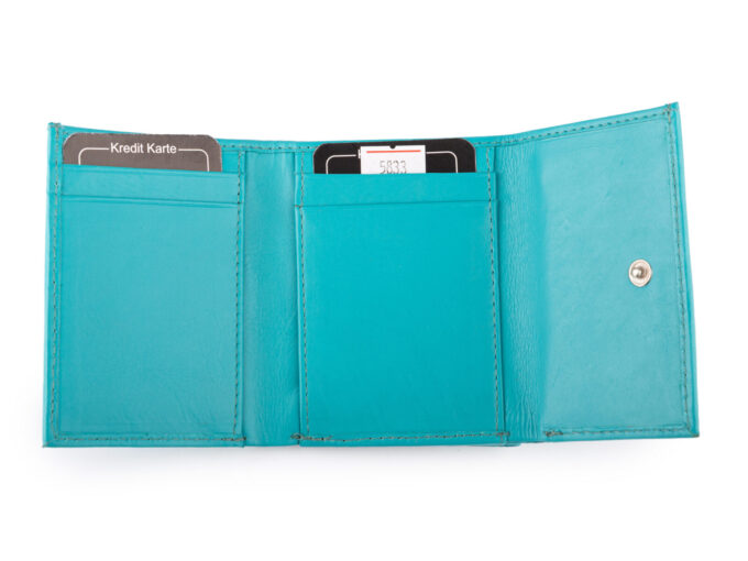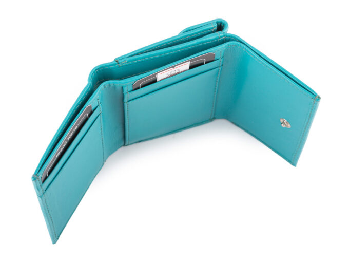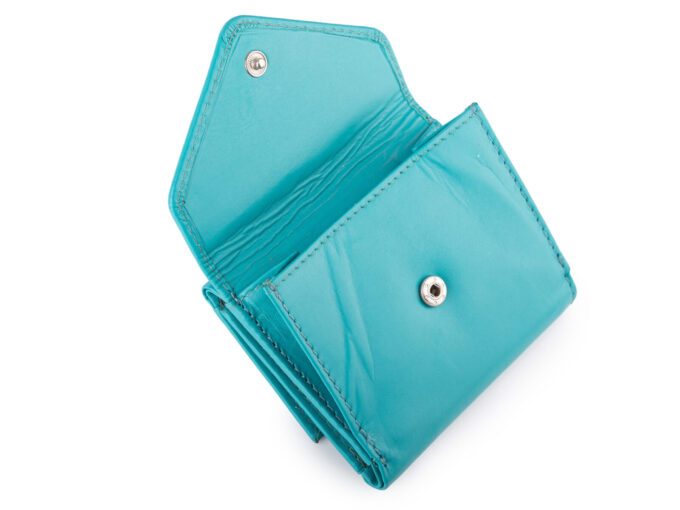 - Mały, skórzany portfel damski w kolorze turkusowym.