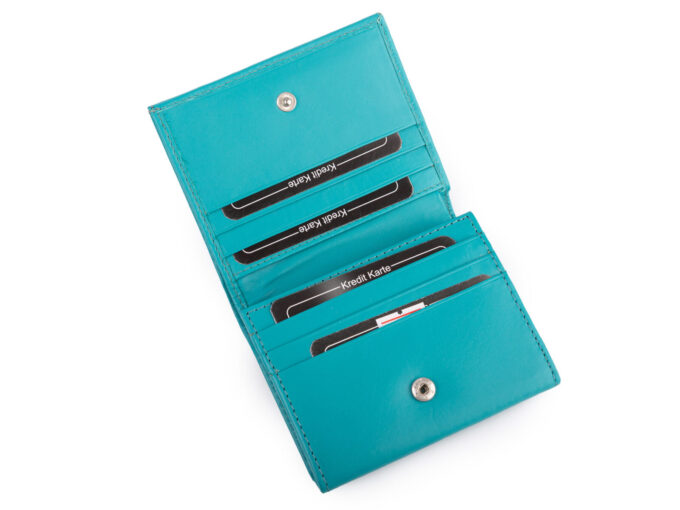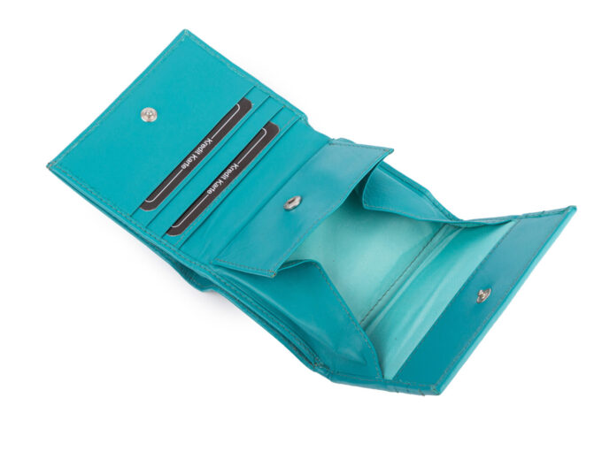 - Stylowy, kompaktowy, jasnoturkusowy portfel damski wykonany z wysokiej jakości miękkiej i przyjemnej w dotyku skóry naturalnej.