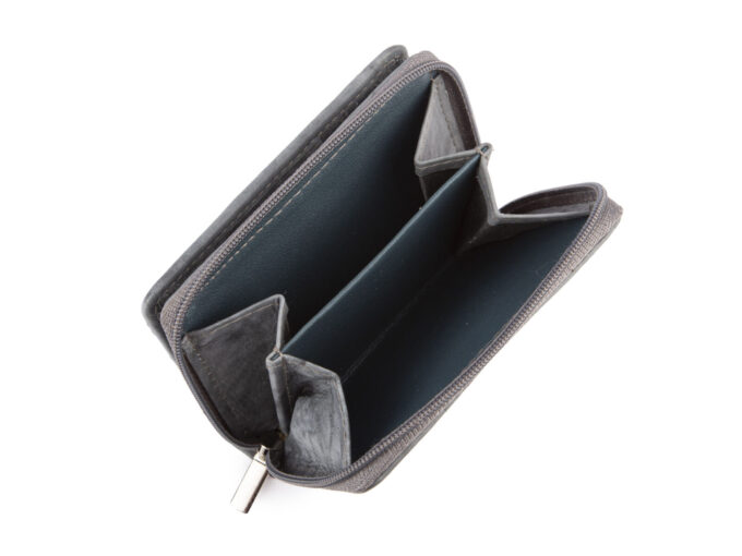 - Mały portfel damski uszyty z miękkiej skóry naturalnej w kolorze szarym.