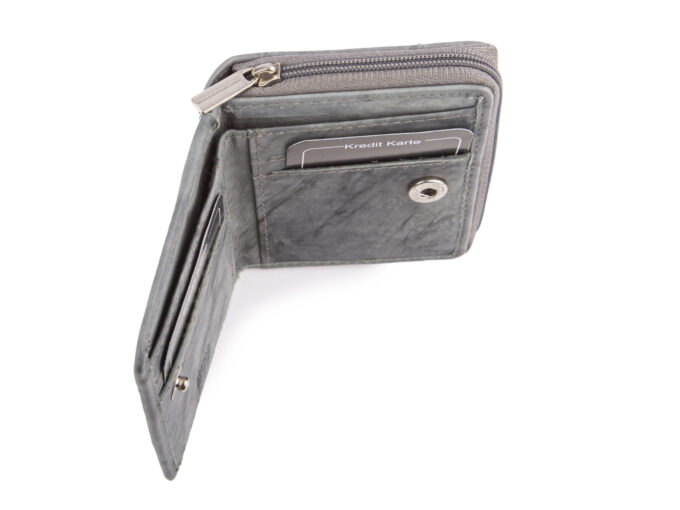 - Wewnątrz portfel posiada miejsce na karty płatnicze i lojalnościowe, dokumenty wielkości dowodu osobistego albo prawa jazdy, banknoty, oraz monety.