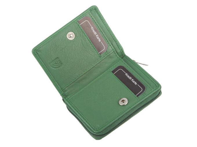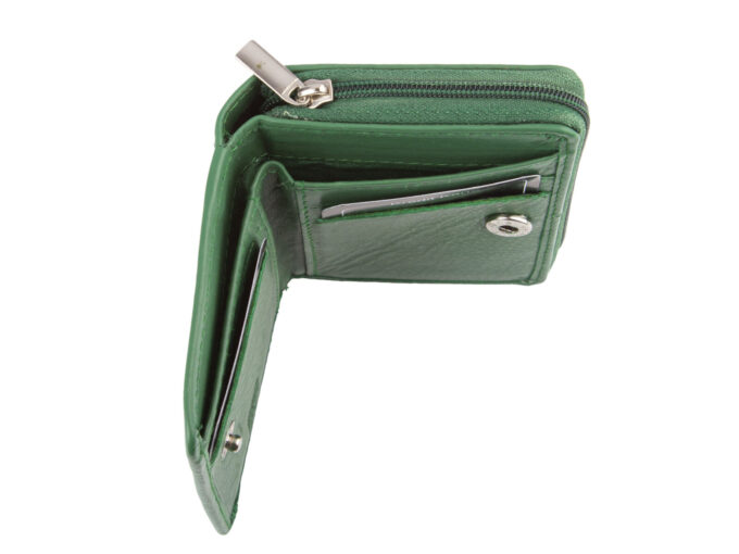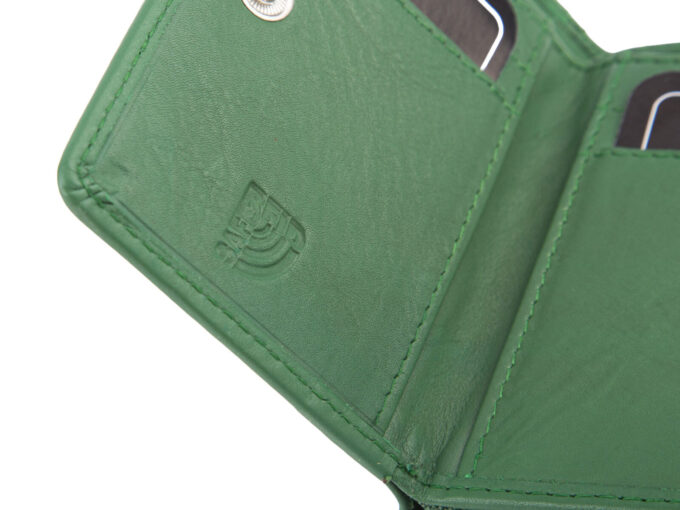 - Mały portfel damski uszyty z miękkiej skóry naturalnej w kolorze zielonym.