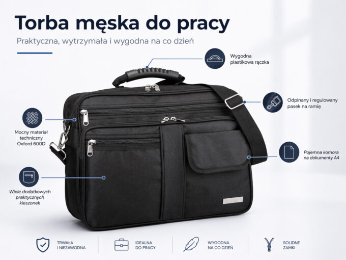 - Model torby męskiej nadający się idealnie do pracy, lub na studia.