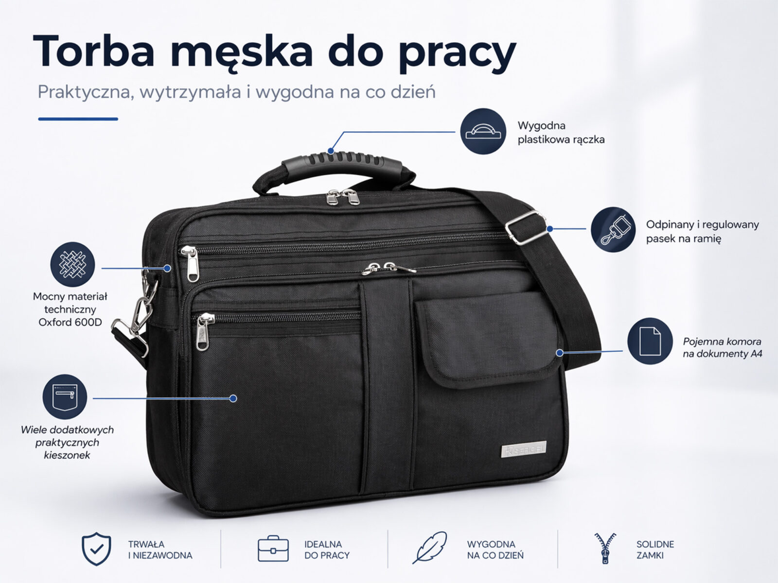 Solidna, elegancka torba męska na ramię – idealna do pracy. Biznesowa stylistyka, nowoczesny wygląd z przemyślaną i praktyczną konstrukcją. Uszyta z mocnego materiału technicznego (Oxford 600D). Wyposażona w odpinany i regulowany pasek na ramię, oraz solidną rączkę. Pełna specyfikacja ⬇