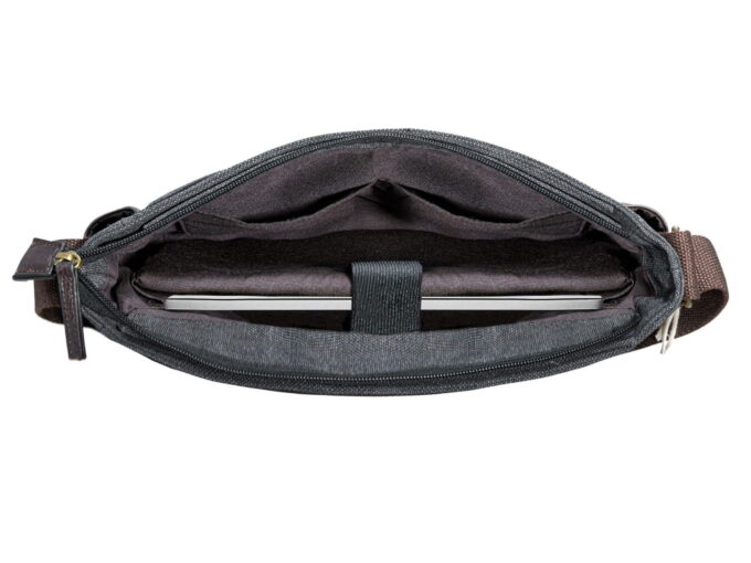 - Wewnątrz znajduje się usztywniona pianką przegroda na mały laptop lub tablet. W przegrodzie mieści się np. 13-calowy Macbook Pro lub Air.