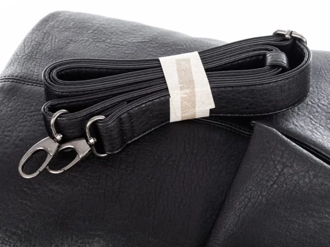 - W zestawie znajdują się dwa odpinane paski – jeden do noszenia torebki w dłoni (60 cm.), drugi, długi i regulowany, do noszenia na ramieniu (max. 140 cm.).