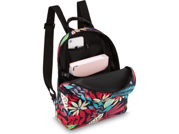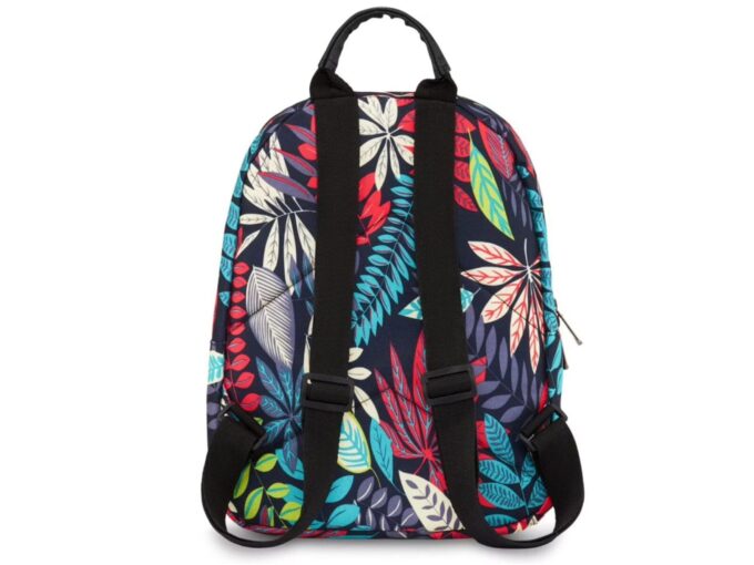 - Lekki, kolorowy damski plecak miejski z radosnym wzorem w kwiaty.