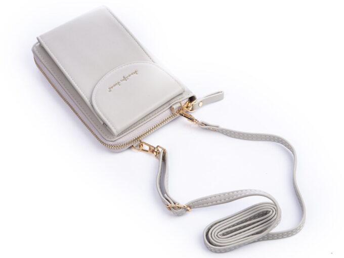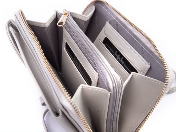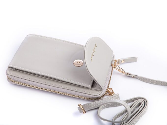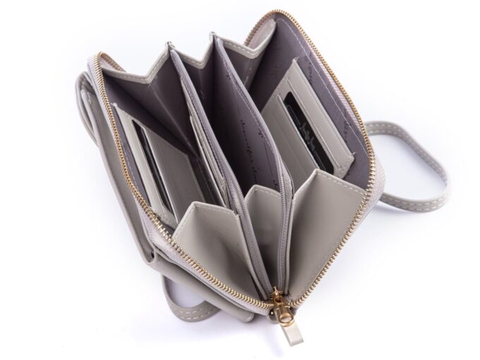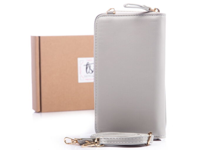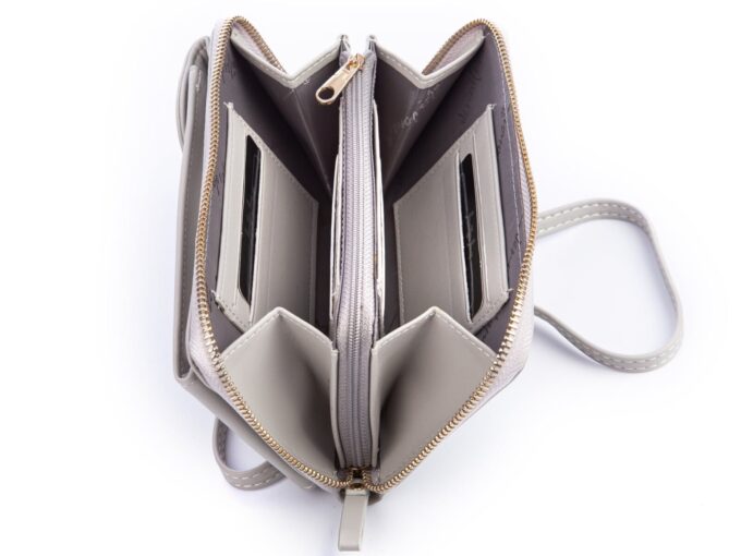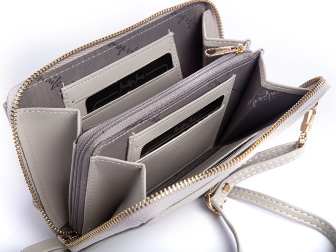 - Szara, pionowa mini torebka damska / portfel z kieszenią na telefon komórkowy.