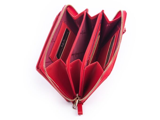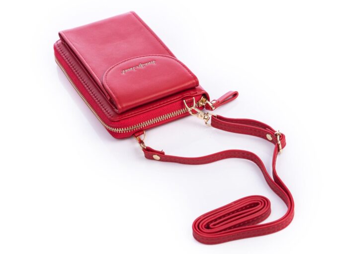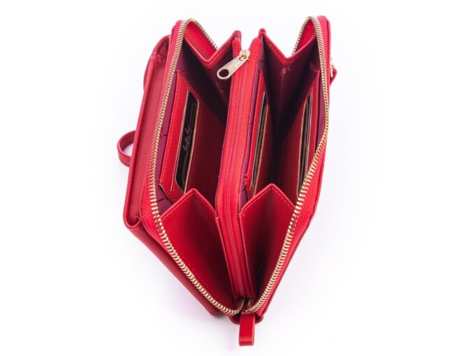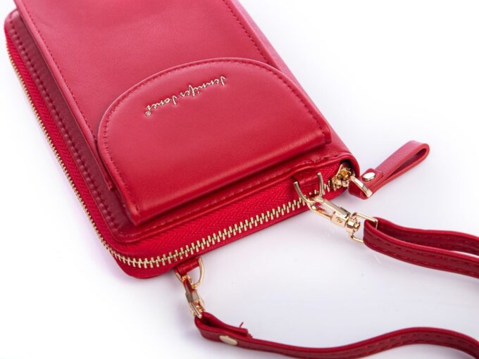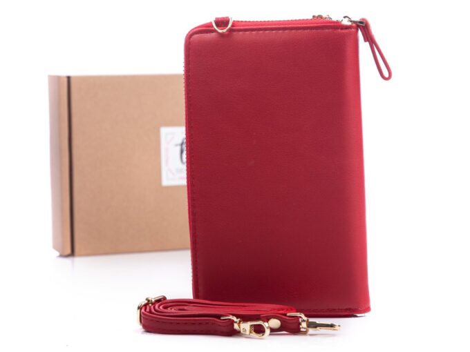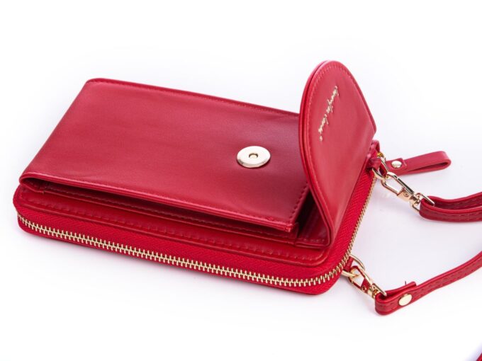 - Czerwona, pionowa mini torebka damska / portfel z kieszenią na telefon komórkowy.