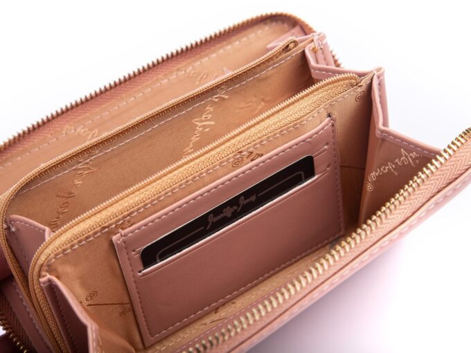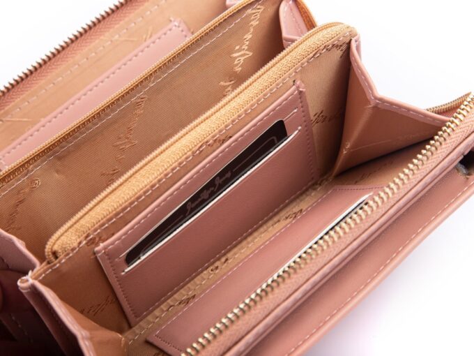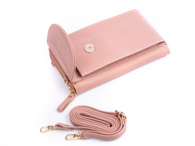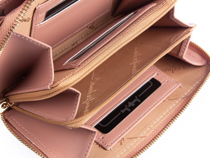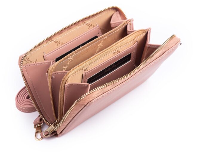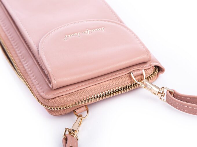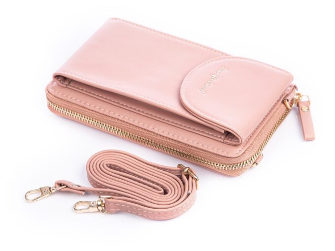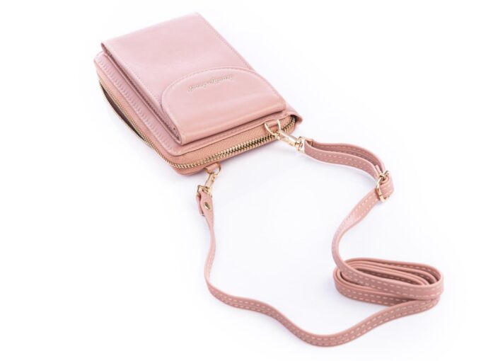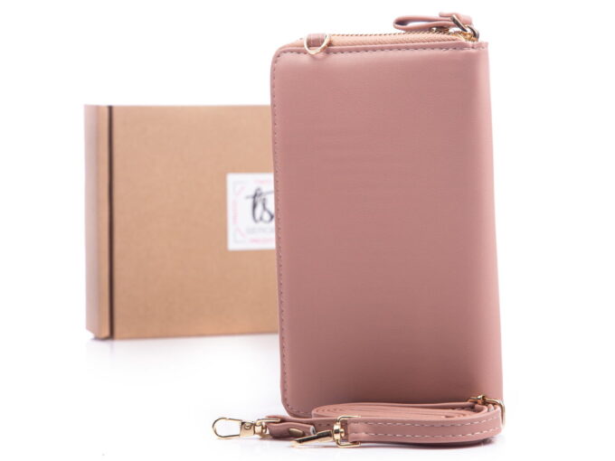 - Jasnoróżowa, pionowa mini torebka damska / portfel z kieszenią na telefon komórkowy.