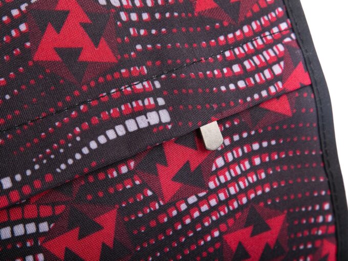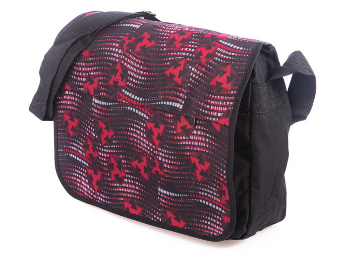 Cechuje ją przemyślana konstrukcja, która bez problemu pomieści dokumenty w formacie A4, drugie śniadanie, butelkę z wodą i wszelkie niezbędne na co dzień akcesoria. Wykonana została z gładkiego i przyjemnego w dotyku, odpornego na zabrudzenia poliestru z wewnętrzną, nieprzemakalną membraną, co gwarantuje długotrwałe i bezproblemowe użytkowanie. Dodatkowo, klapka torby ozdobiona jest oryginalnymi wzorami w kolorach czerwonym i czarnym, dodającym jej unikalnego charakteru.