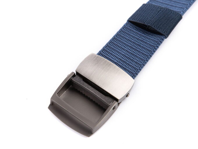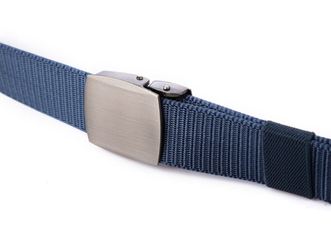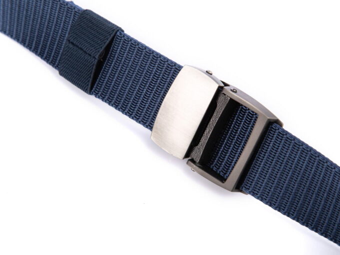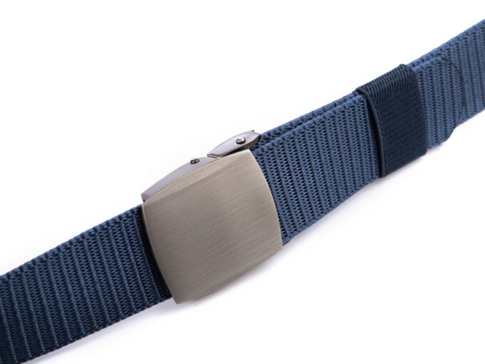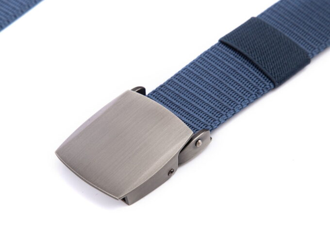- Mocny, materiałowy pasek męski do spodni w kolorze ciemnoniebieskim z solidnie wykonaną, metalową klamrą zaciskową w kolorze szczotkowanej stali.