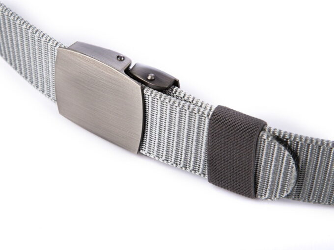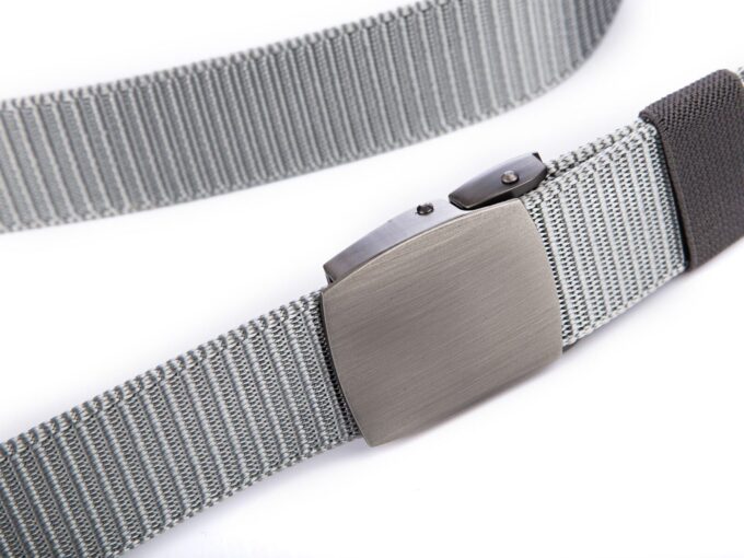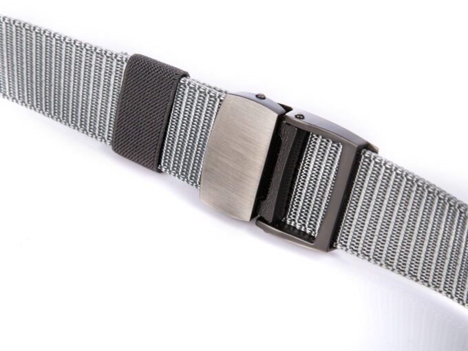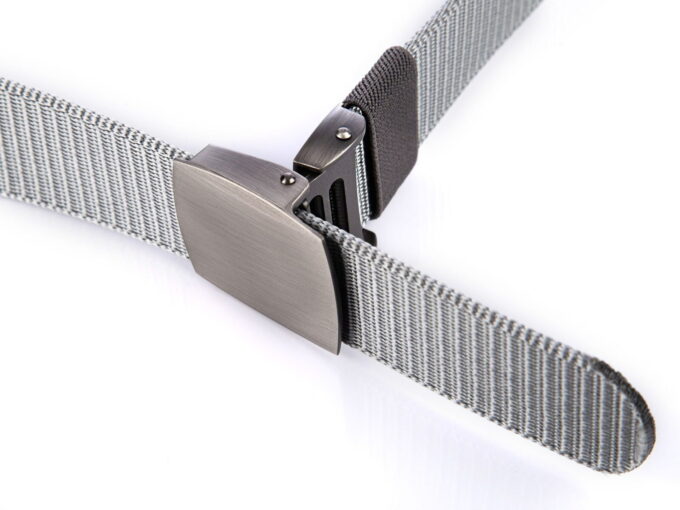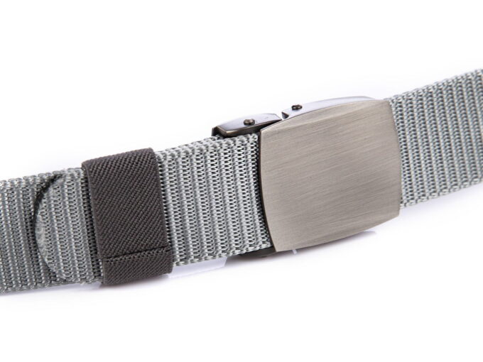 - Mocny, materiałowy pasek męski do spodni w kolorze szarym z soldnie wykonaną, metalową klamrą zaciskową w kolorze szczotkowanej stali.