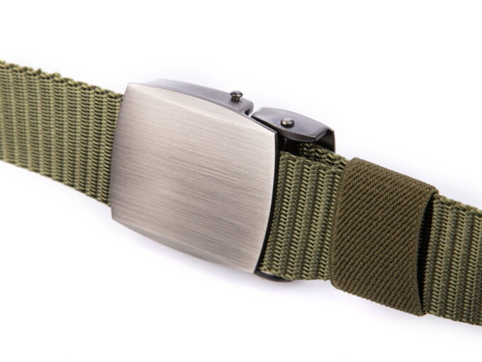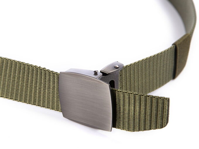 - Mocny, materiałowy pasek męski do spodni w kolorze zielonym z solidnie wykonaną, metalową klamrą zaciskową w kolorze szczotkowanej stali.