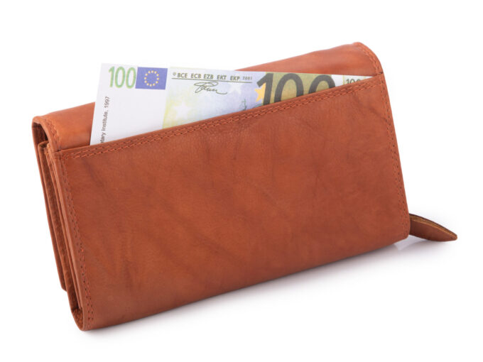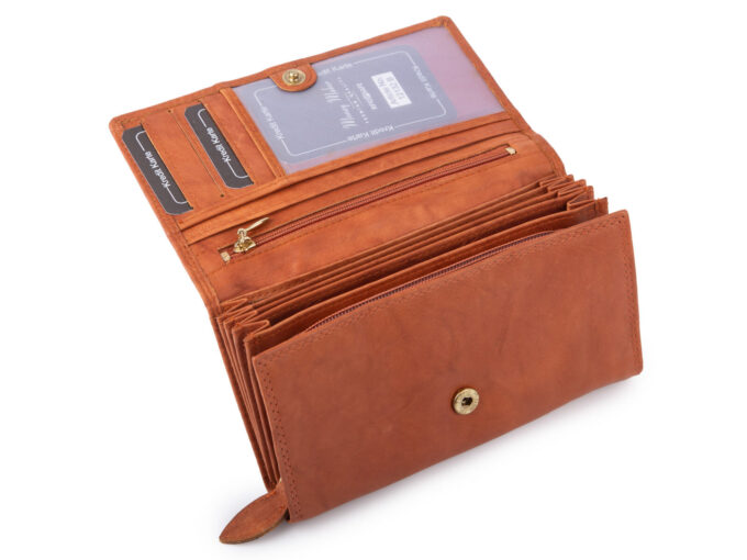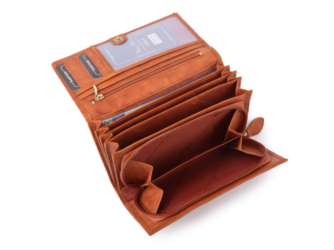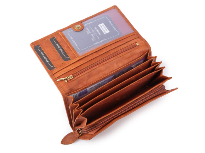 - Duży, koniakowo-brązowy, portfel damski niemieckiej marki Money Maker.