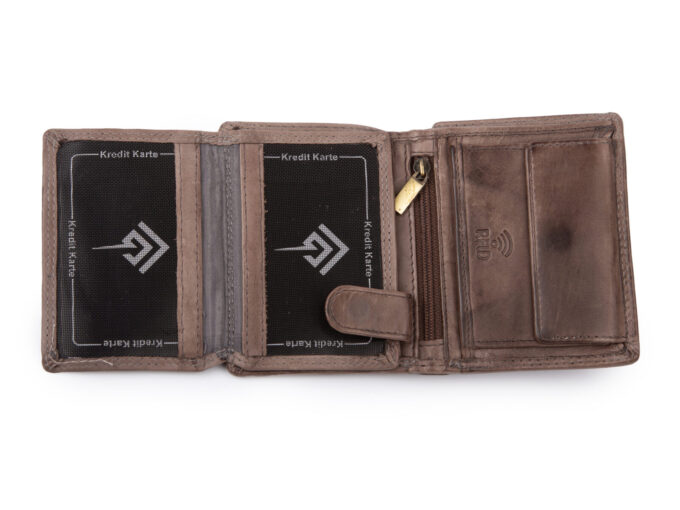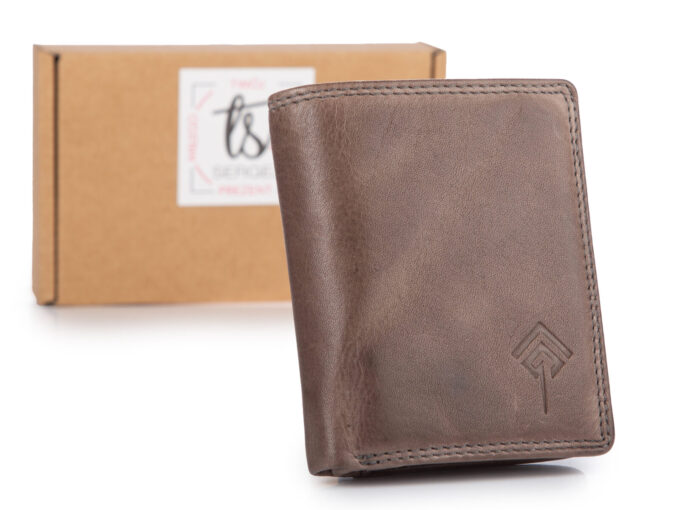 - Nieduży, skórzany portfel w kolorze szarym (z lekkim nasyceniem brązu tworzącym oryginalny i elegancki odcień).