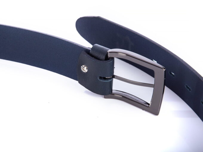 - Mocny pasek męski do spodni wykonany z najwyższej jakości, grubej skóry naturalnej licowej w kolorze granatowym.