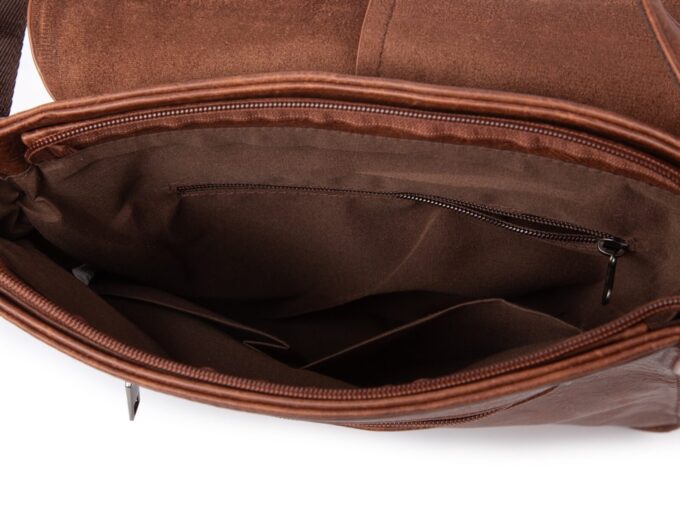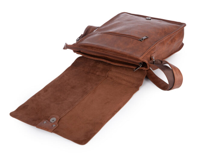 - Pionowa, brązowa torba męska na ramię Herisson Firenze z klapą, wykonana z miękkiej skóry ekologicznej.