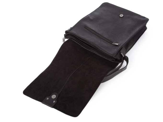 - Pionowa, czarna torba męska na ramię Herisson Firenze z klapą, wykonana z miękkiej skóry ekologicznej.