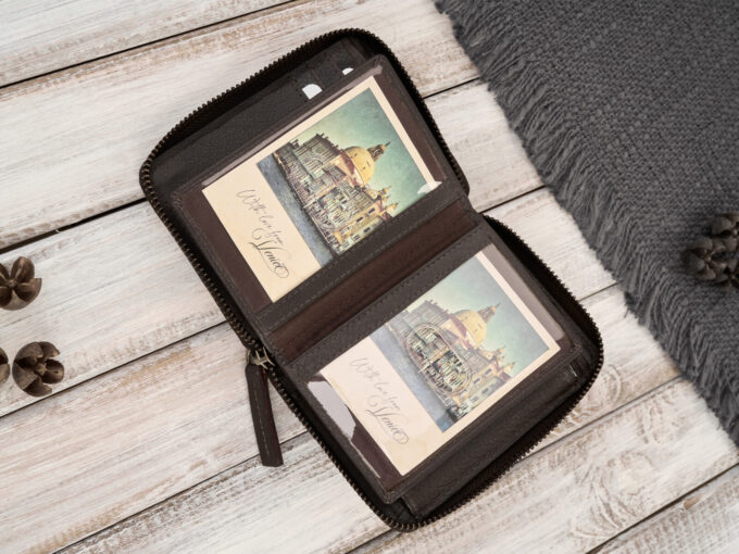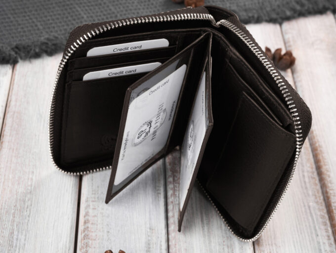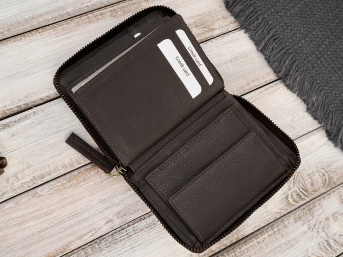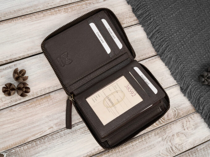 - Pionowy, ciemnobrązowy portfel męski zapinany dookoła na zamek błyskawiczny.
