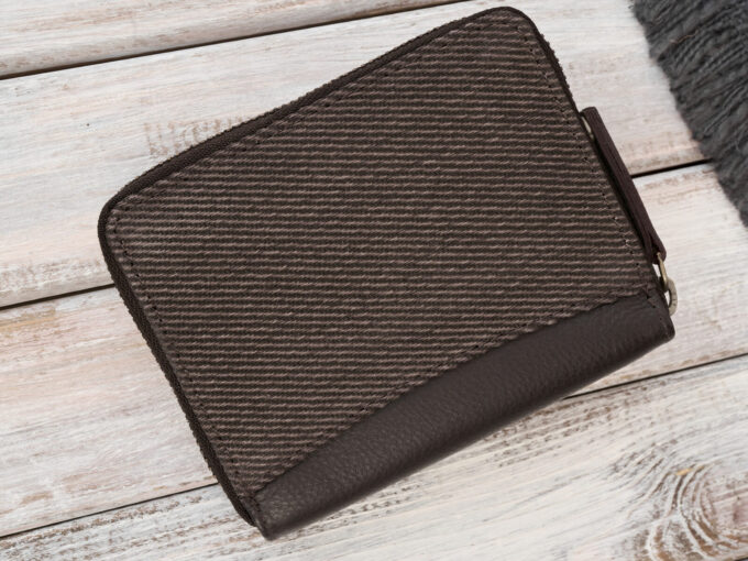 Pionowy, ciemnobrązowy portfel męski zapinany na zamek błyskawiczny, z canvasu i skóry