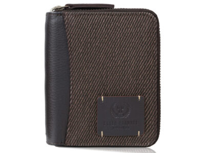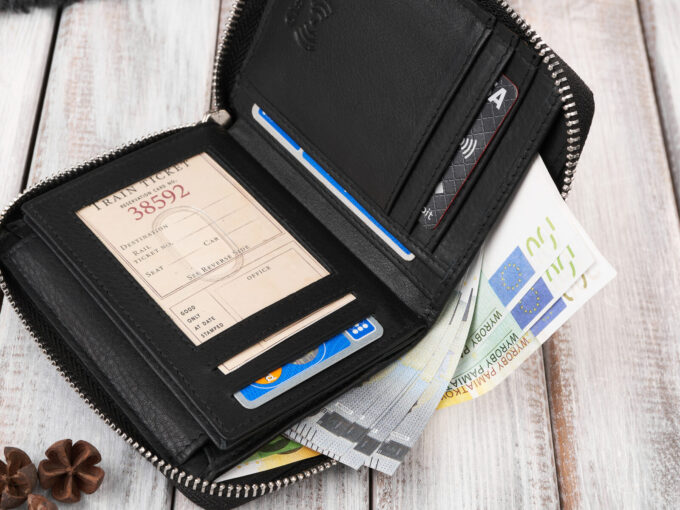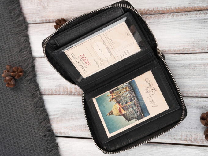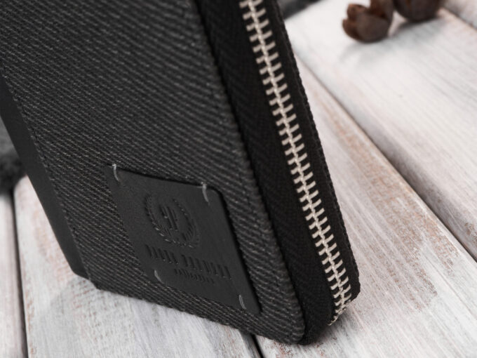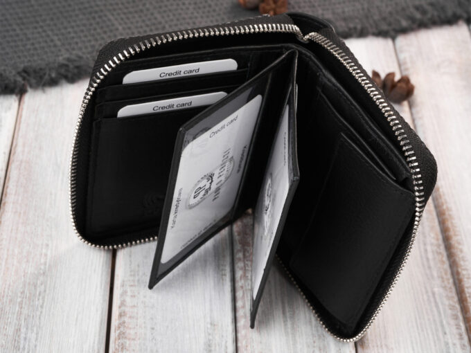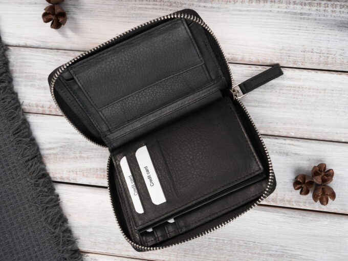 - Pionowy, czarny portfel męski zapinany dookoła na zamek błyskawiczny.