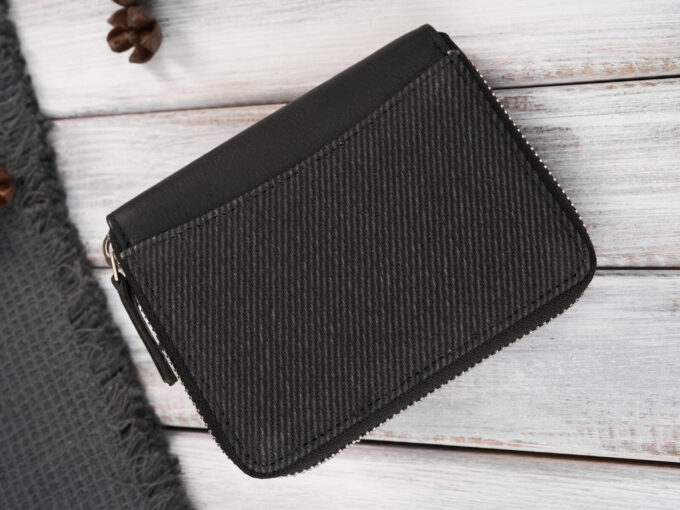 Pionowy, czarny portfel męski zapinany na zamek błyskawiczny, z canvasu i skóry
