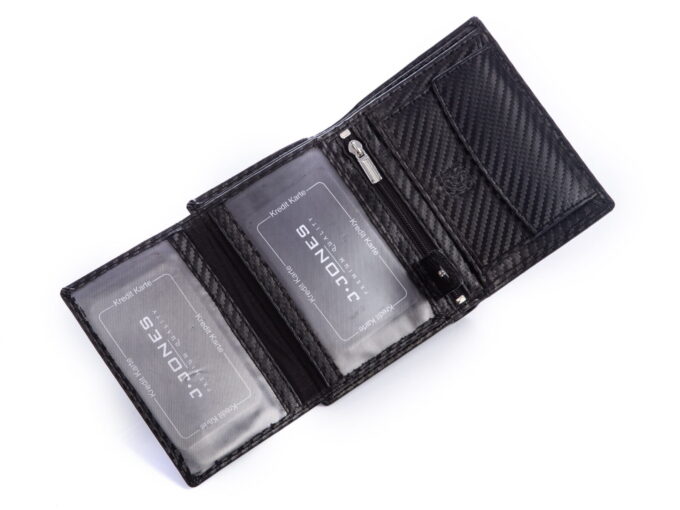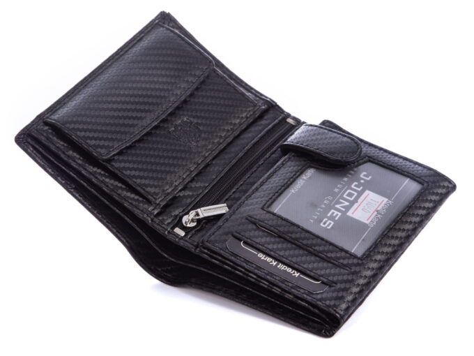 Pionowy portfel męski czarny carbon skórzany trifold RFID J Jones