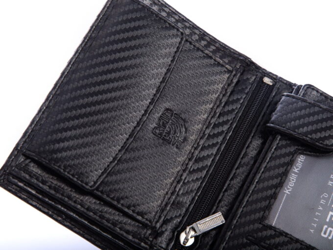 - Duży, pionowy portfel męski typu trifold w kolorze czarnym z carbonowym wzorem.