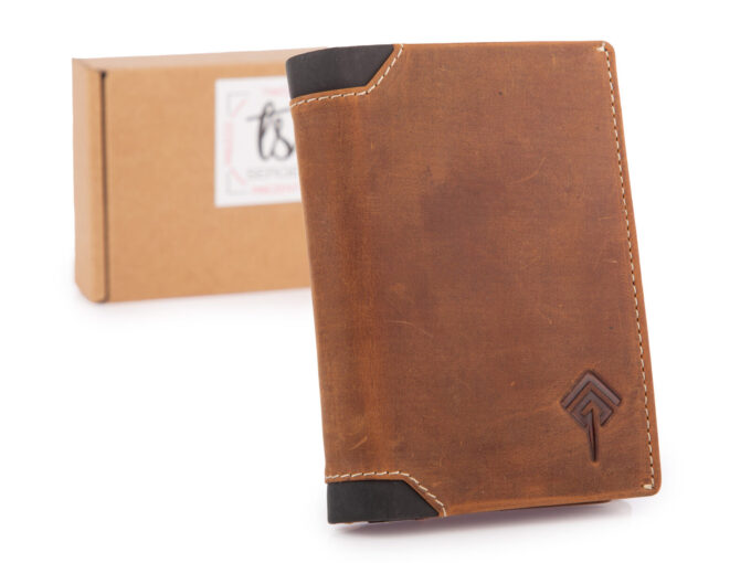 Pionowy portfel męski skórzany szyty ręcznie brązowy Ekavale z ochroną RFID