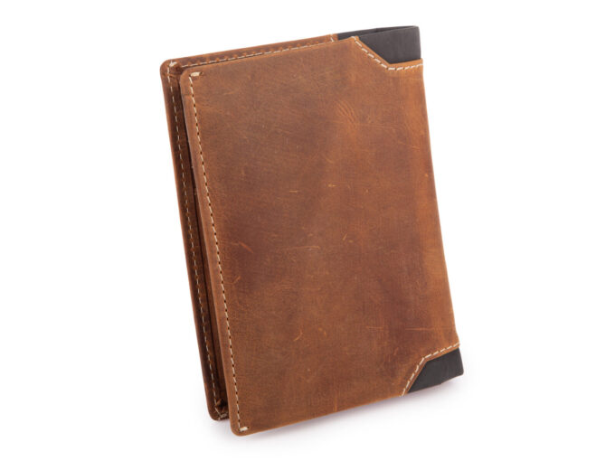 - Pionowy, szyty ręcznie portfel męski skórzany w kolorze brązowym z czarnymi detalami.