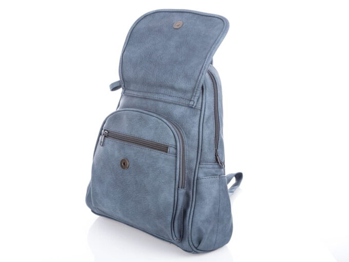 - Z przodu, plecak posiada modną klapę, na niej umieszczona została kieszonka zapinana na zamek błyskawiczny,
